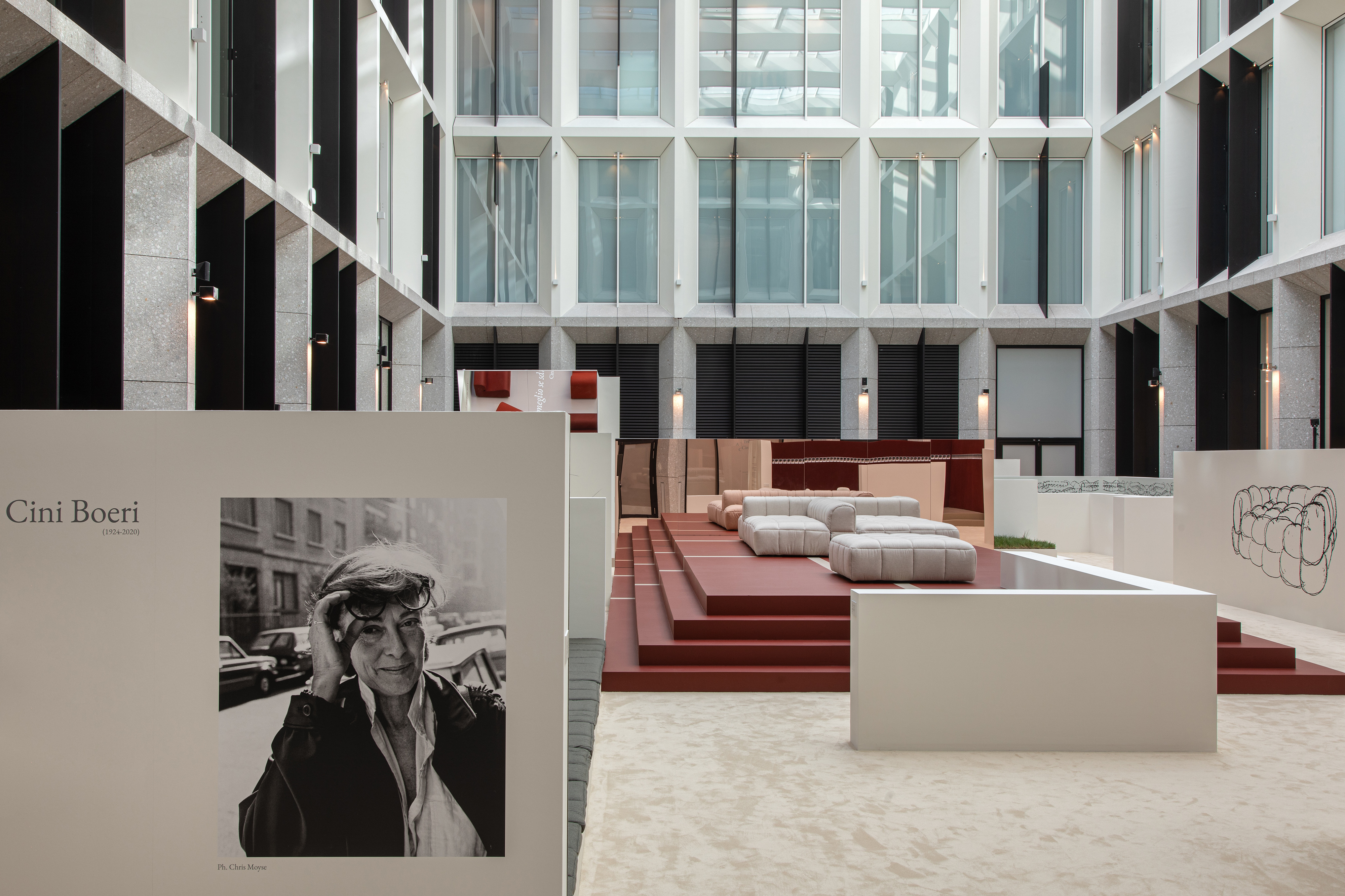 A portrait of iconic designer, Cini Boeri, greets visitors at the Loro Piana Interiors exhibition at Milan Design Week 2024