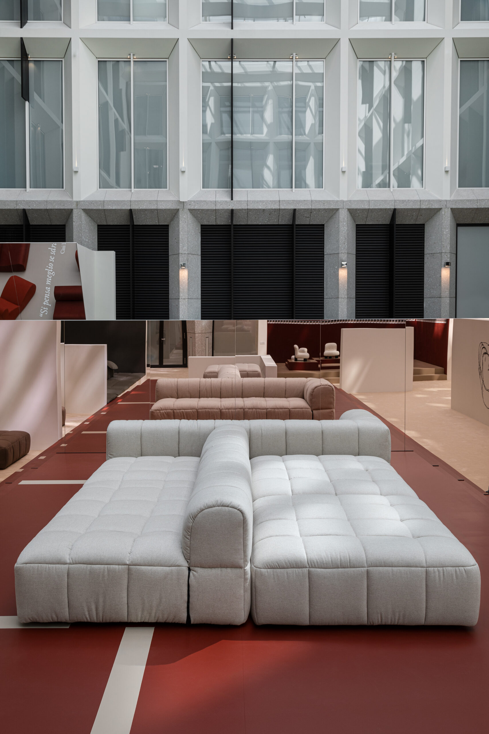 The exhibition features Boeri’s iconic designs, such as the modular Strips system, Strips bed, Pecorelle sofas and armchairs, Bobo and Boborelax armchairs, and Botolo high and low chairs. Each piece is upholstered in Loro Piana Interiors’ exquisite fabrics, including Cashfur, Cashmere Raw, Tiepolo wool, Cashmere Sherpas, and the exclusive Pecora Nera®.