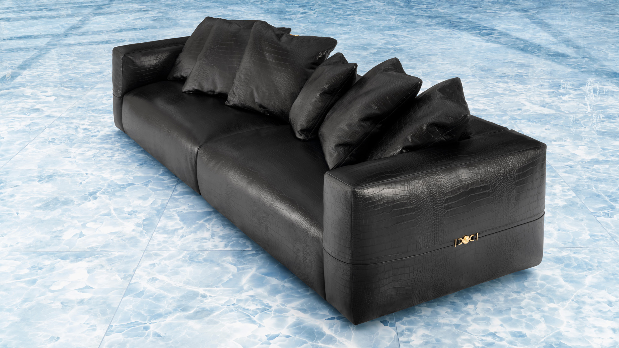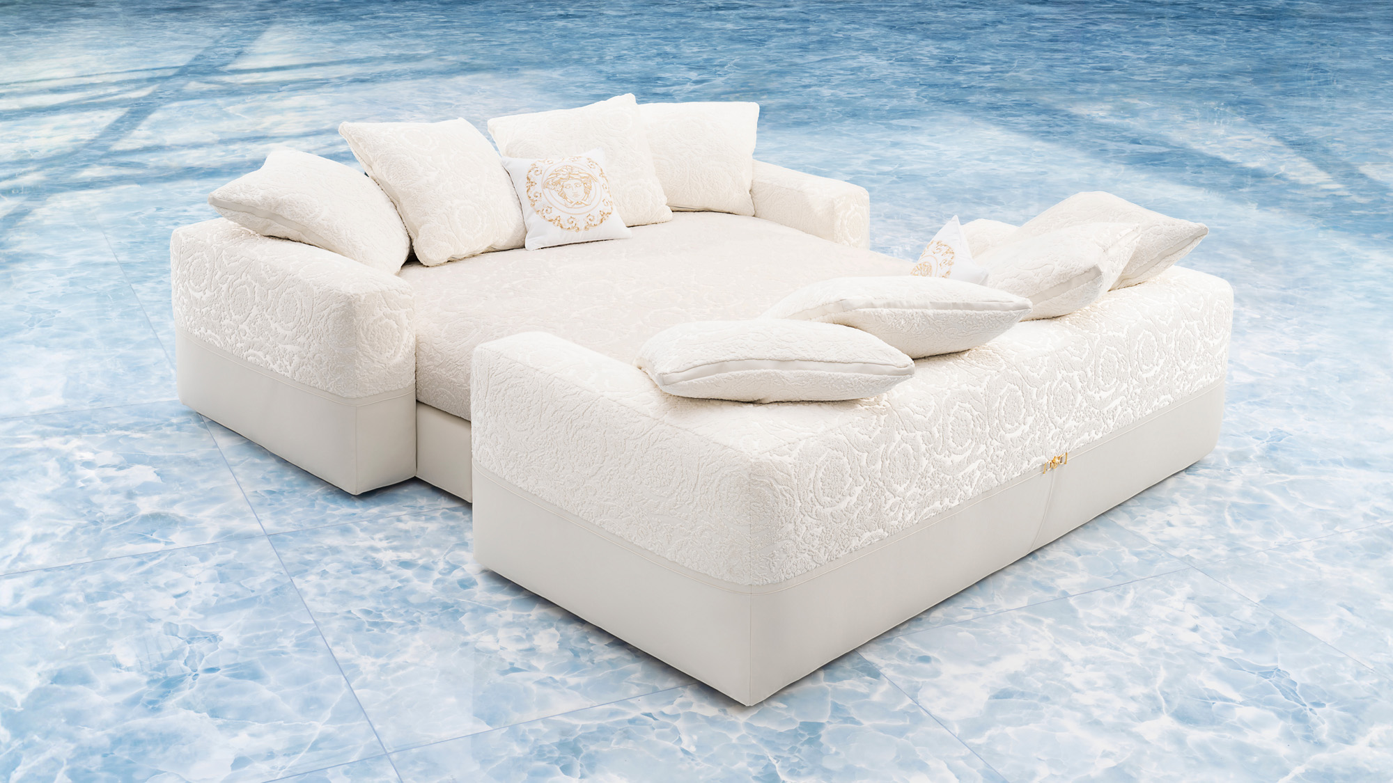 The collection, centered around Versace’s iconic design codes – the Medusa, Barocco, and Greca – pays homage to the House’s legacy. These symbols, originally designed and developed within the studios of Palazzo Versace, are masterfully incorporated into furniture, lighting, textiles, and more. The standout piece, the Medusa ’95 Conversation Sofa, embodies Versace’s lavish scale and inviting comfort, resembling a large bed with fine leather trim details and chenille Barocco reclining cushions.