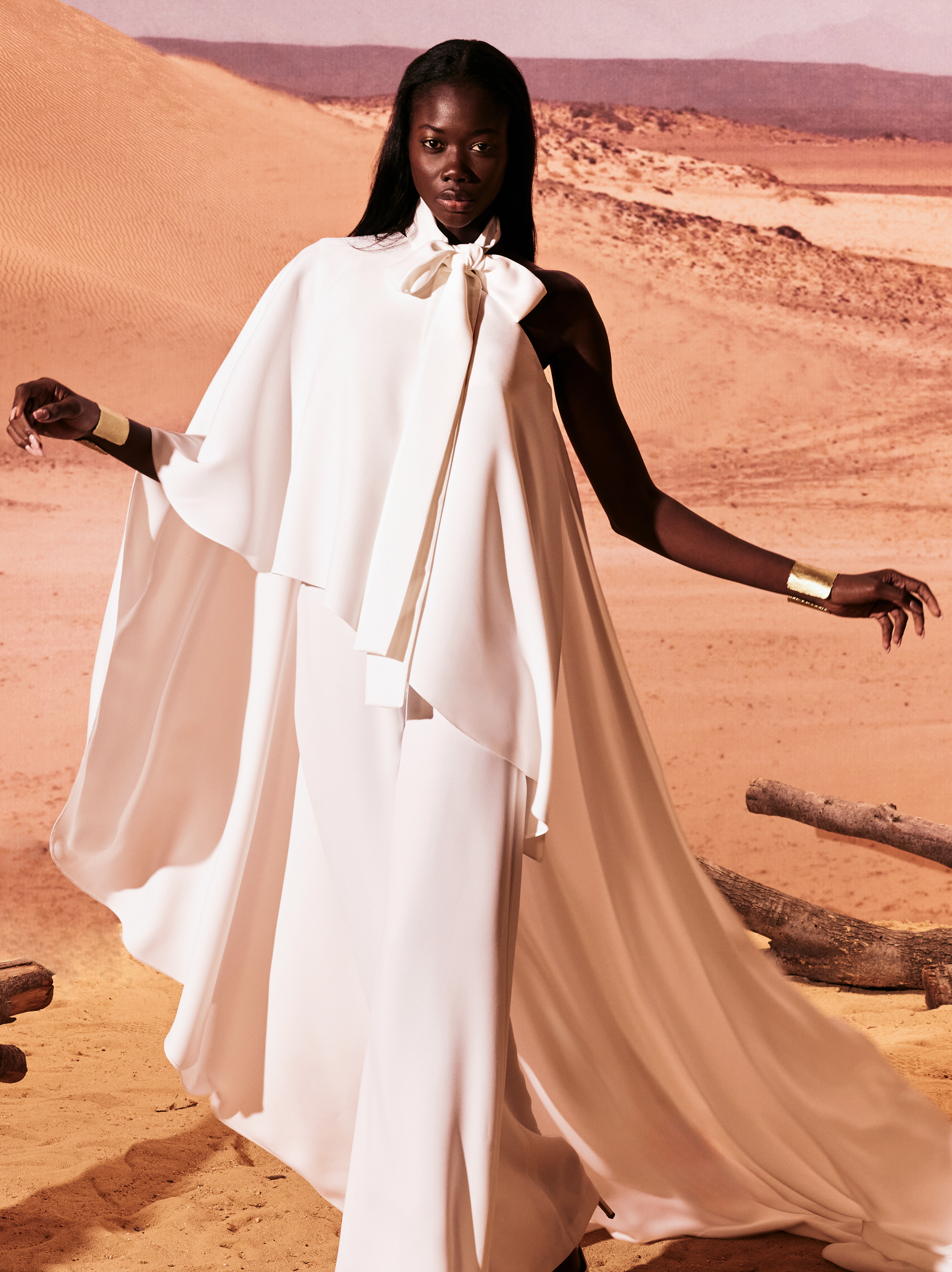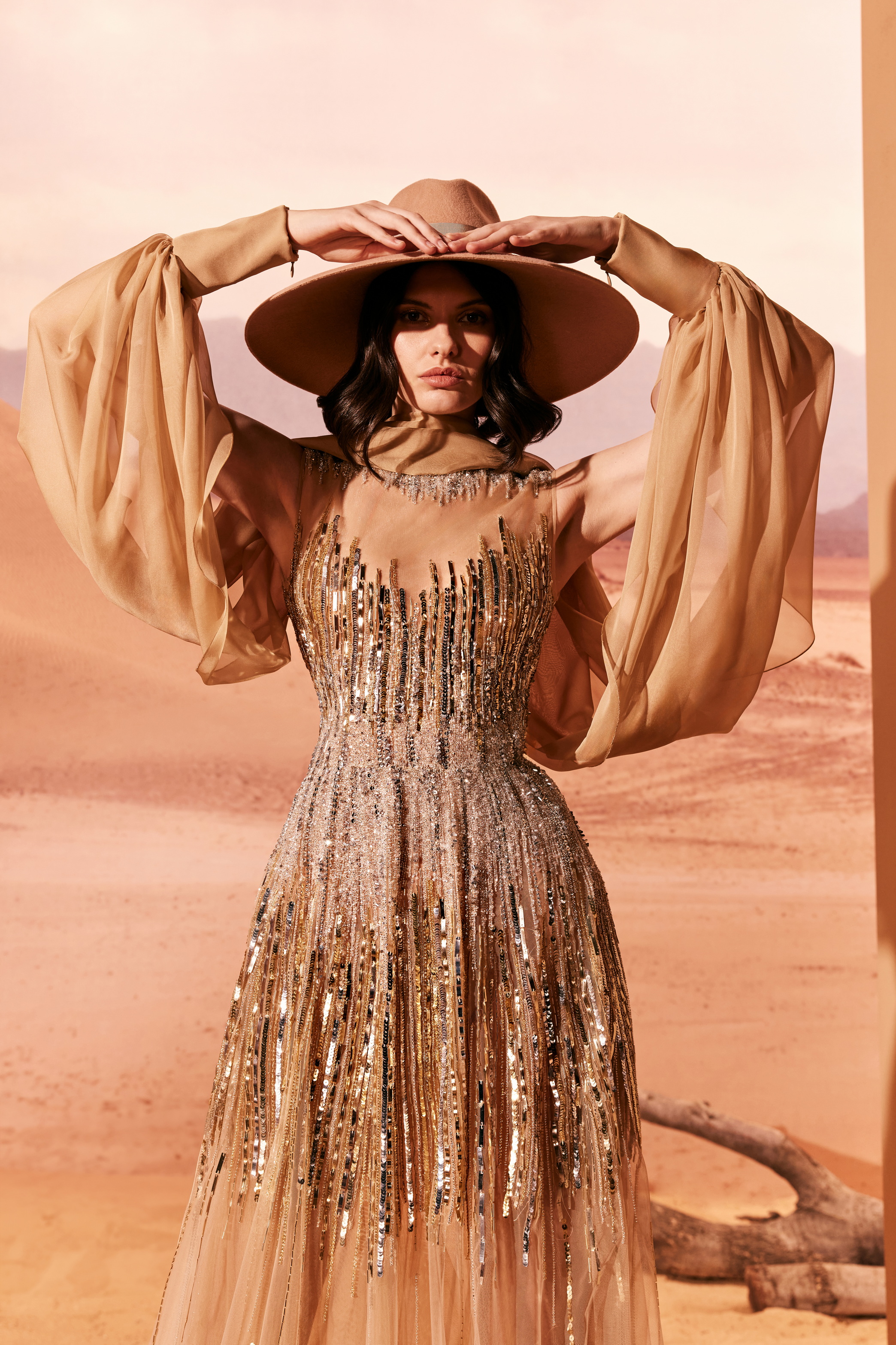 Tony Ward plays with textures that reflect the shifting sands and changing lights of a desert landscape. The shimmering fabrications sparkle against the vastness of the open space, like stars coming out as the sky transitions from day to night.