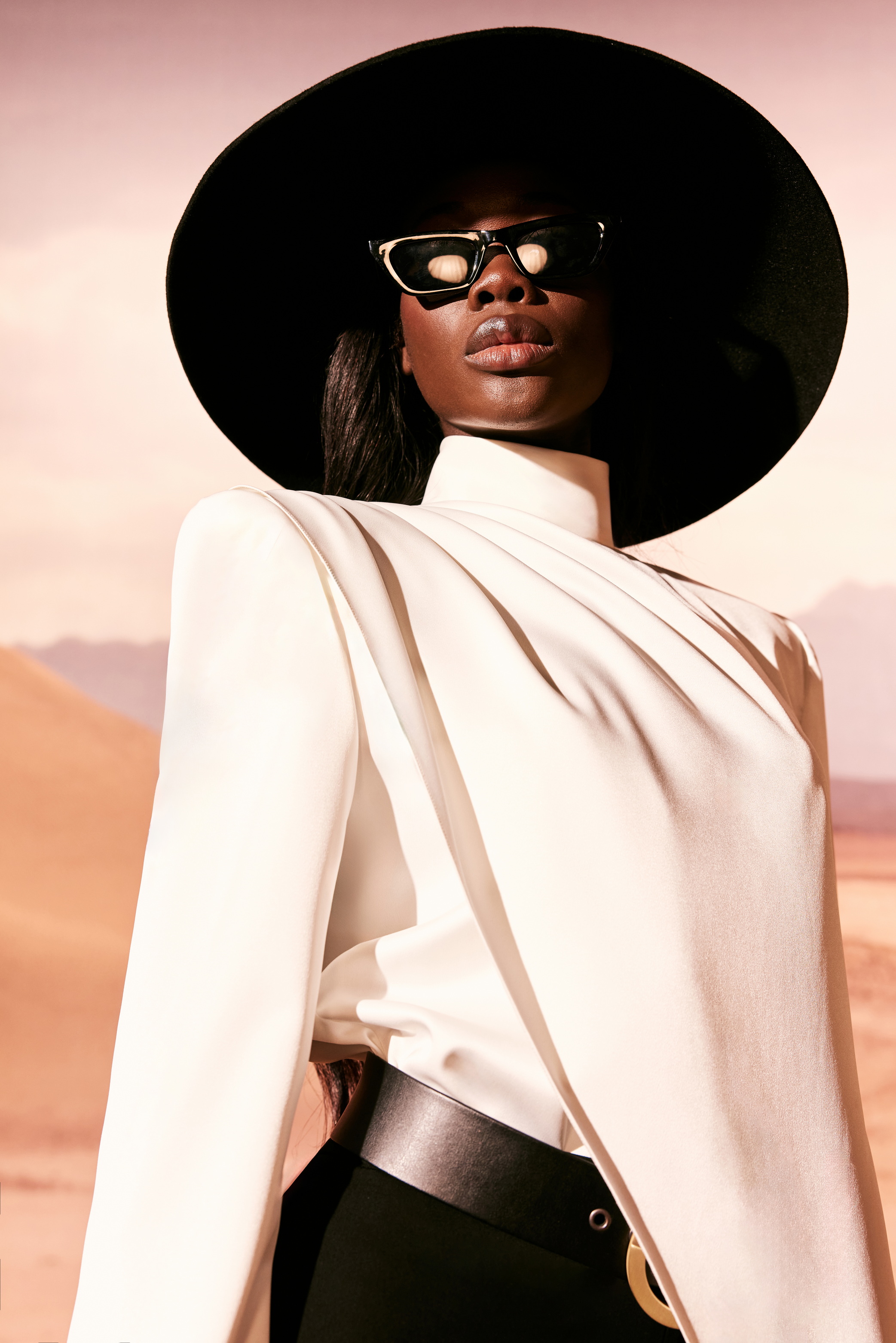 The collection captures the essence of a serene desert at the brink of dusk. It’s a tactile and visual safari that takes us through a warm palette of Rubin red, pink quartz, blue serenity, and water green. The use of oversized hats and sculptural forms clinches the waist, while flattering cargo silk pants mixed with sheer shirts provide a modern take on the classic explorer’s attire.