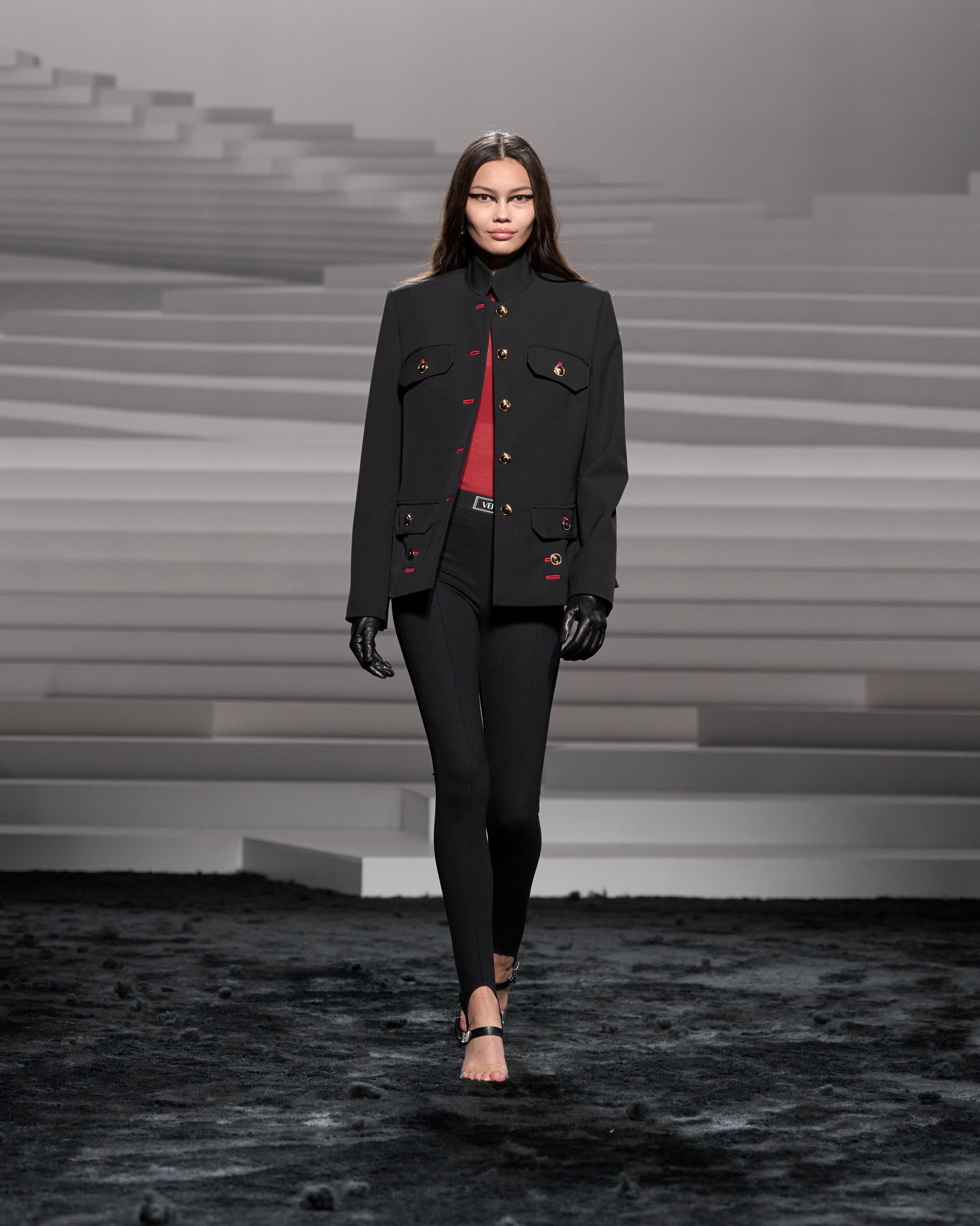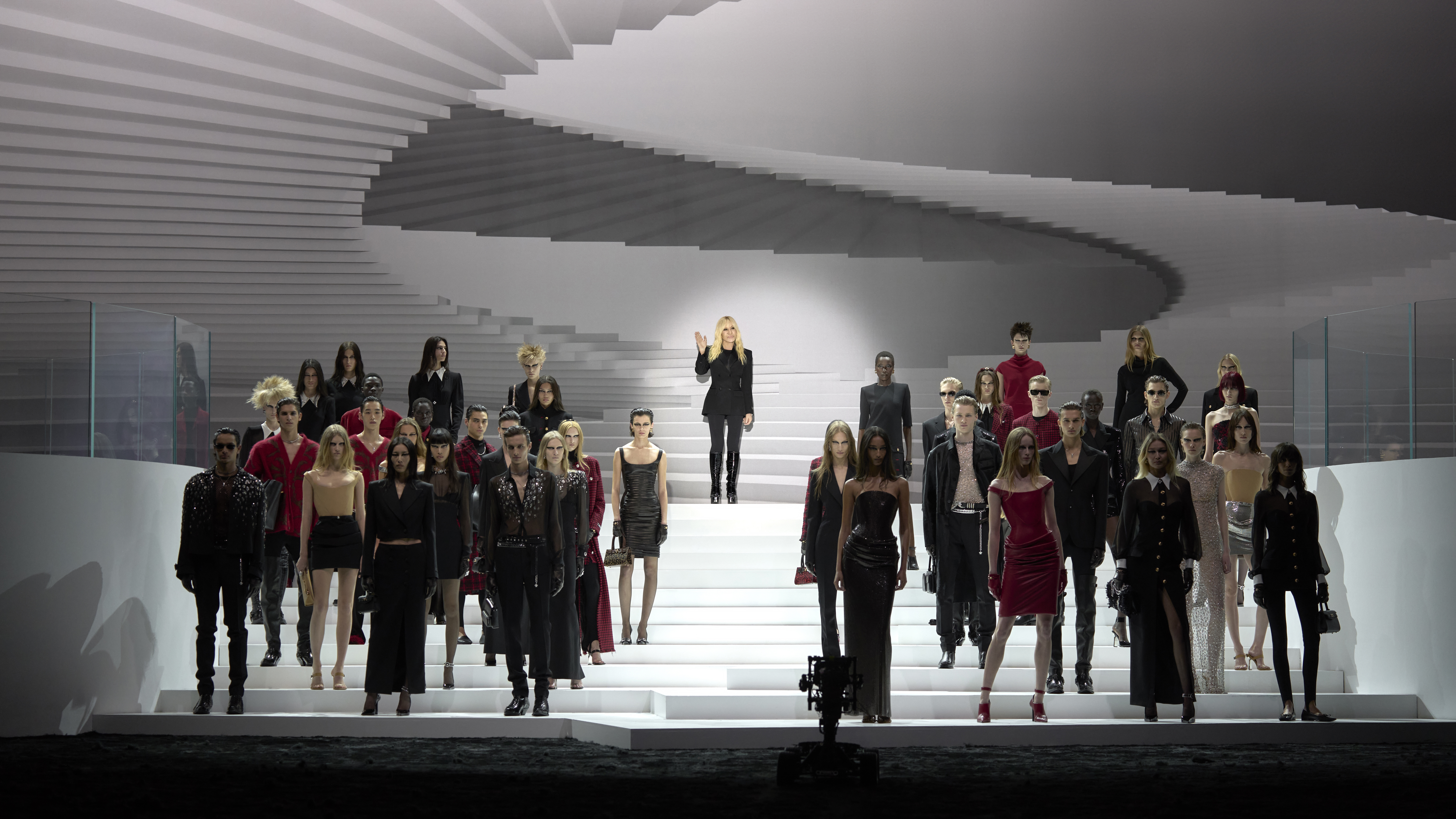 The designs encapsulate this philosophy, reimagining the codes of contemporary formal tailoring with innovative cuts, drapes, and embellishments. Donatella adds, “The clothes take the codes of contemporary formal tailoring and disrupt them with cut, drape, and embellishment. The collection focuses on pure lines, innovative fabrics, considered wildness. This is us. This is Versace!” This passionate declaration sets the stage for a collection that dares to defy convention while celebrating the brand’s iconic legacy.