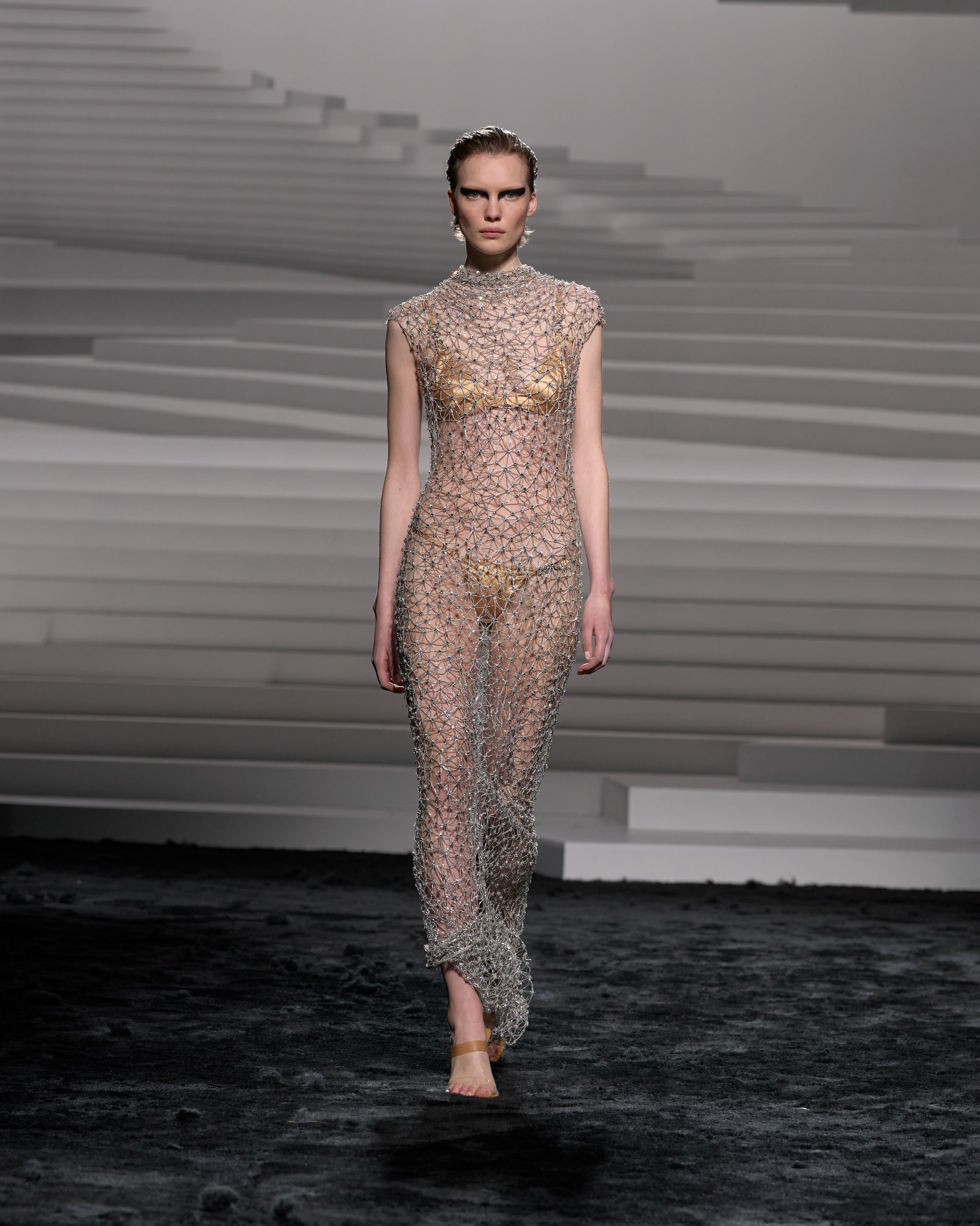 The collaboration between Atelier Versace and ready-to-wear is a collection highlight, merging haute couture detail with everyday luxury. Metal mesh column gowns and crystal-encrusted designs exemplify Versace’s meticulous craftsmanship, blurring the lines between couture and ready-to-wear with elegance.