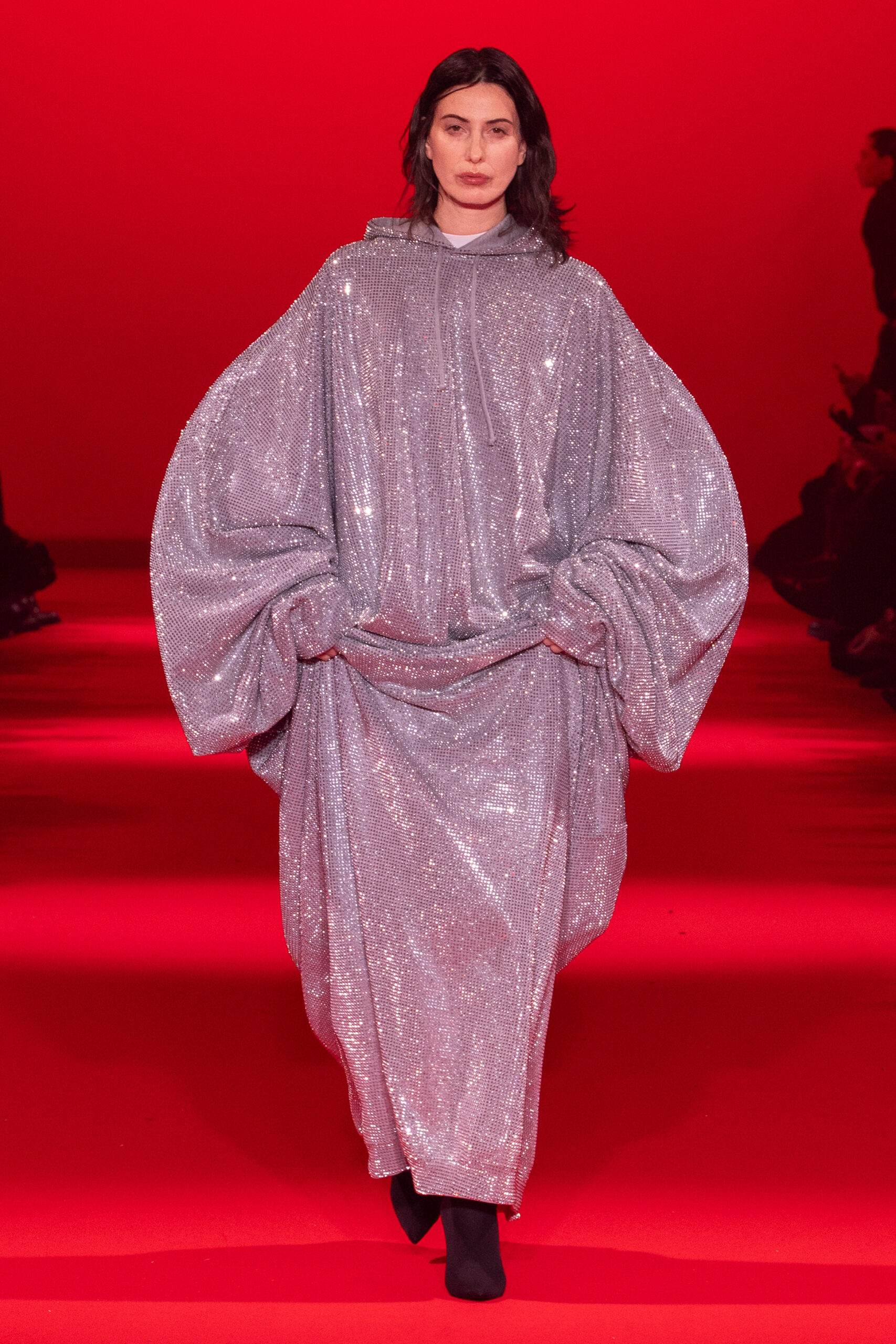 This season’s offerings were a tribute to Vetements’ design ethos—deconstructing fashion norms with a confident hand. The runway brought to life an array of bold silhouettes, from sequined gowns that hugged the body like a second glittering skin to oversized hoodies that were reimagined as evening wear, exuding a casual yet opulent air. Standout pieces like glittering gowns juxtaposed its streamlined silhouette with the textural complexity of sequins, capturing the light and eyes of onlookers. This play on texture was mirrored in a sequined ensemble that reimagined the classic tracksuit, elevating a casual staple to luxury status.